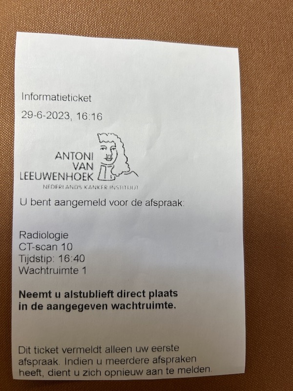 Als we aankomen en de weg gevraagd hebben gevraagd word ik zo snel geholpen dat we het nauwelijks doorhebben. Ze hoeven dan ook niet te prikken, want mijn PICC-lijn werkt goed.