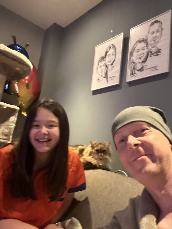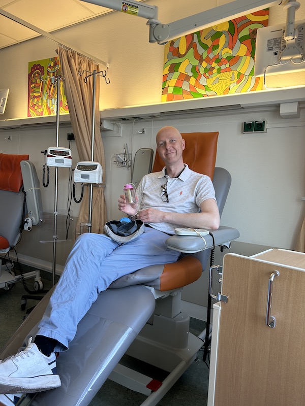 Erg fijn, want ik ben er aardig klaar mee! Het zou kunnen zijn dat dit de laatste chemo in m’n leven was, dat zou gaaf zijn. Maandag de 21ste weet ik of ik de kuur van 8 weken moet afmaken en dus nog 2 weken moet of dat ik mag stoppen omdat hij los genoeg ligt om goed en veilig weg te snijden. Daar doen we het allemaal voor.