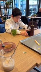 Sylvain in de stress… hij wilde met de lift, maar alleen is dat nog spannend, dus duidelijk afgesproken dat hij op ‘2’ drukt en er daar pas uit gaat.
