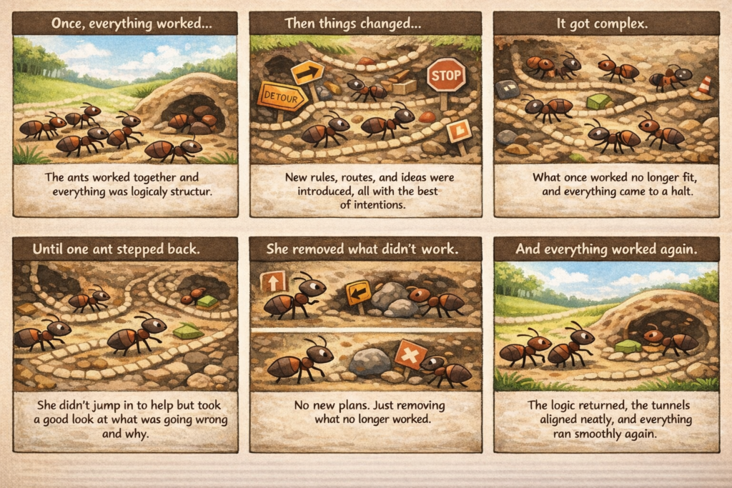 And each time, it seemed like an improvement. But gradually, it all started to accumulate. Worker ants sometimes had to wait for approval. Some took longer routes. Others ended up doing the same work twice. And the nest itself received less attention. Each ant did what she had been taught. Trying to do her own part as well as possible. But slowly, the whole… stopped working. It took more energy. It took more time. Sometimes the food didn’t even arrive. And the costs kept rising. Not because the ants were incapable. But because the logic had disappeared.